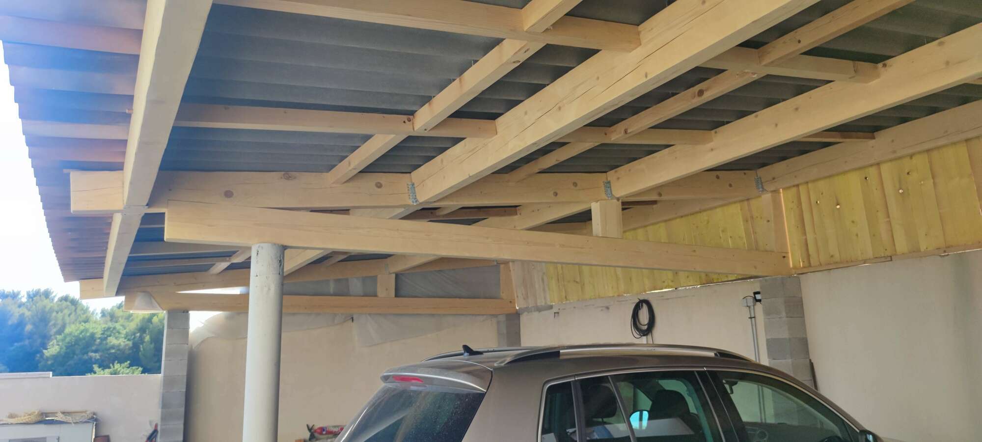 Création d'abri voitures extérieur, travaillé et dessiné sur place; ajustement, fixation et assemblage par cheville en bois